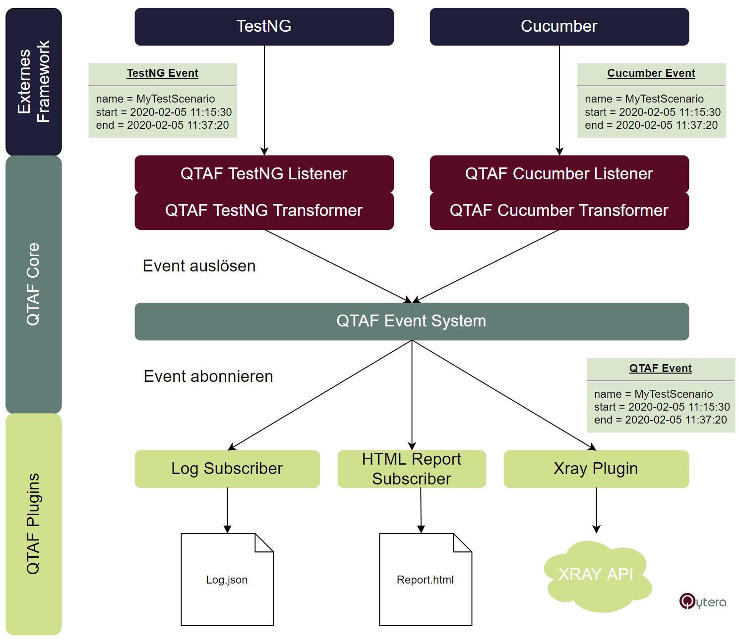Das Qytera Test Automation Framework (QTAF) ist ein von der Qytera GmbH entwickeltes Java-Testframework basierend auf TestNG, welches ein einfaches Aufsetzen neuer Selenium-Testprojekte, HTML-Reporting, Cucumber-Unterstützung, Anbindung an Jira Xray und einfache Erweiterbarkeit bietet.